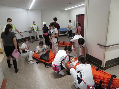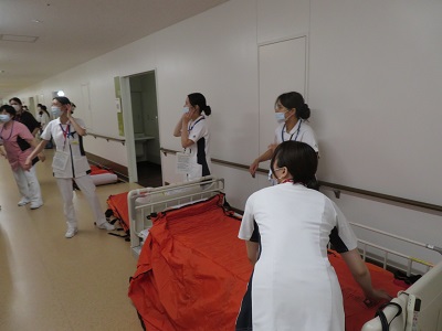 令和7年10月8日(水)に2学年の学生が、名古屋掖済会病院で実施された大規模災害総合防災訓練に患者役・家族役・付き添いの施設職員役・地域からの避難者役として参加しました。